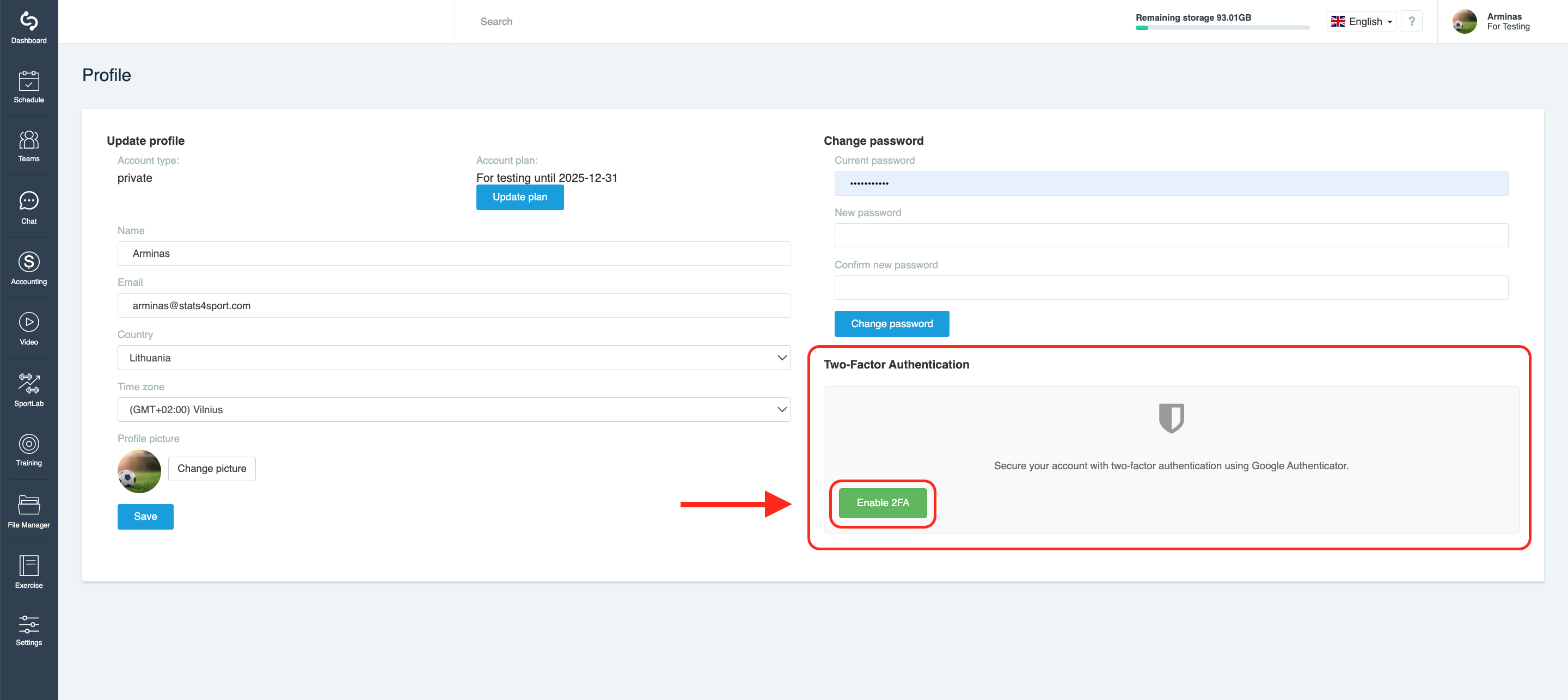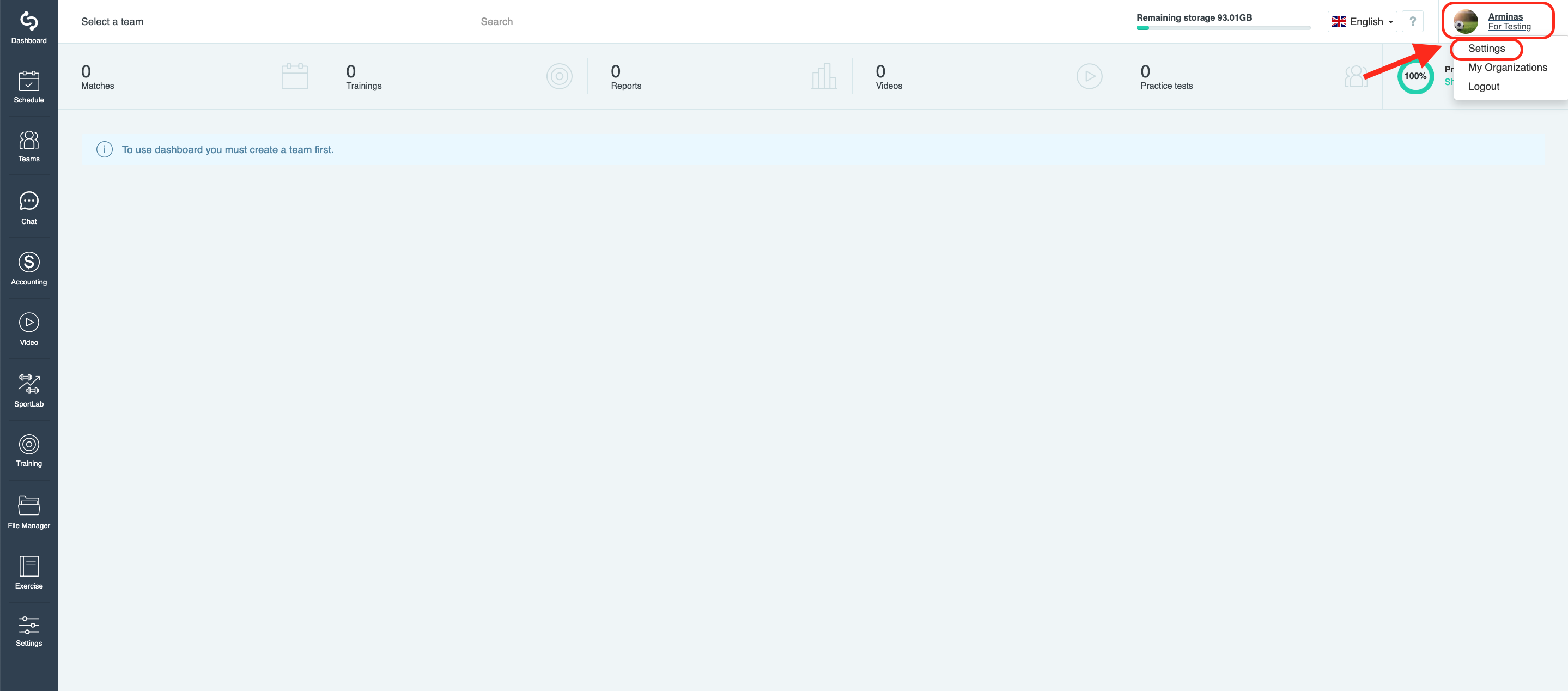 To enable Two-Factor Authentication press the profile menu on the right upper corner and choose 'Settings'.