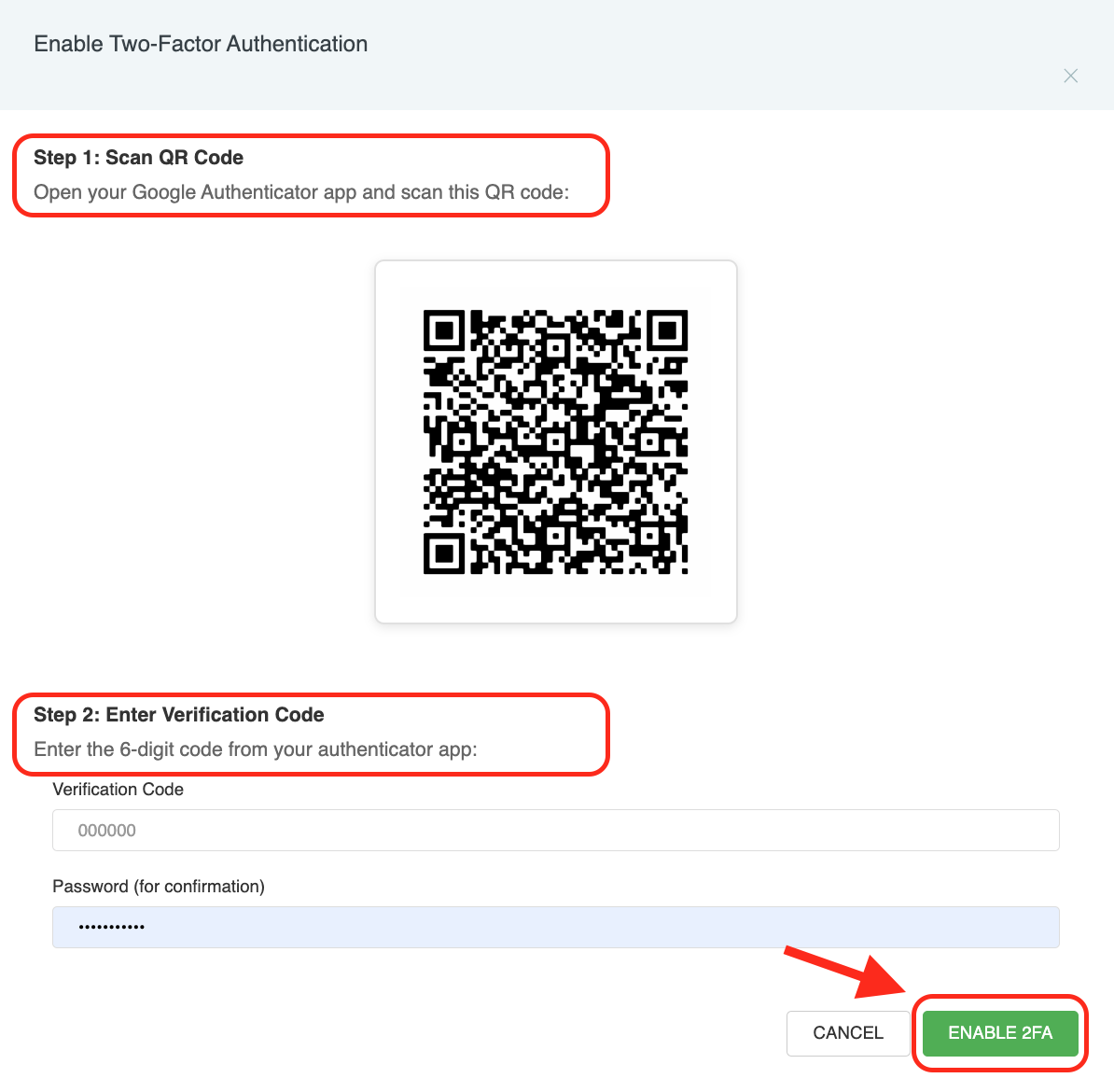 After following the steps 1 and 2, enter your account password and press 'ENABLE 2FA'.
